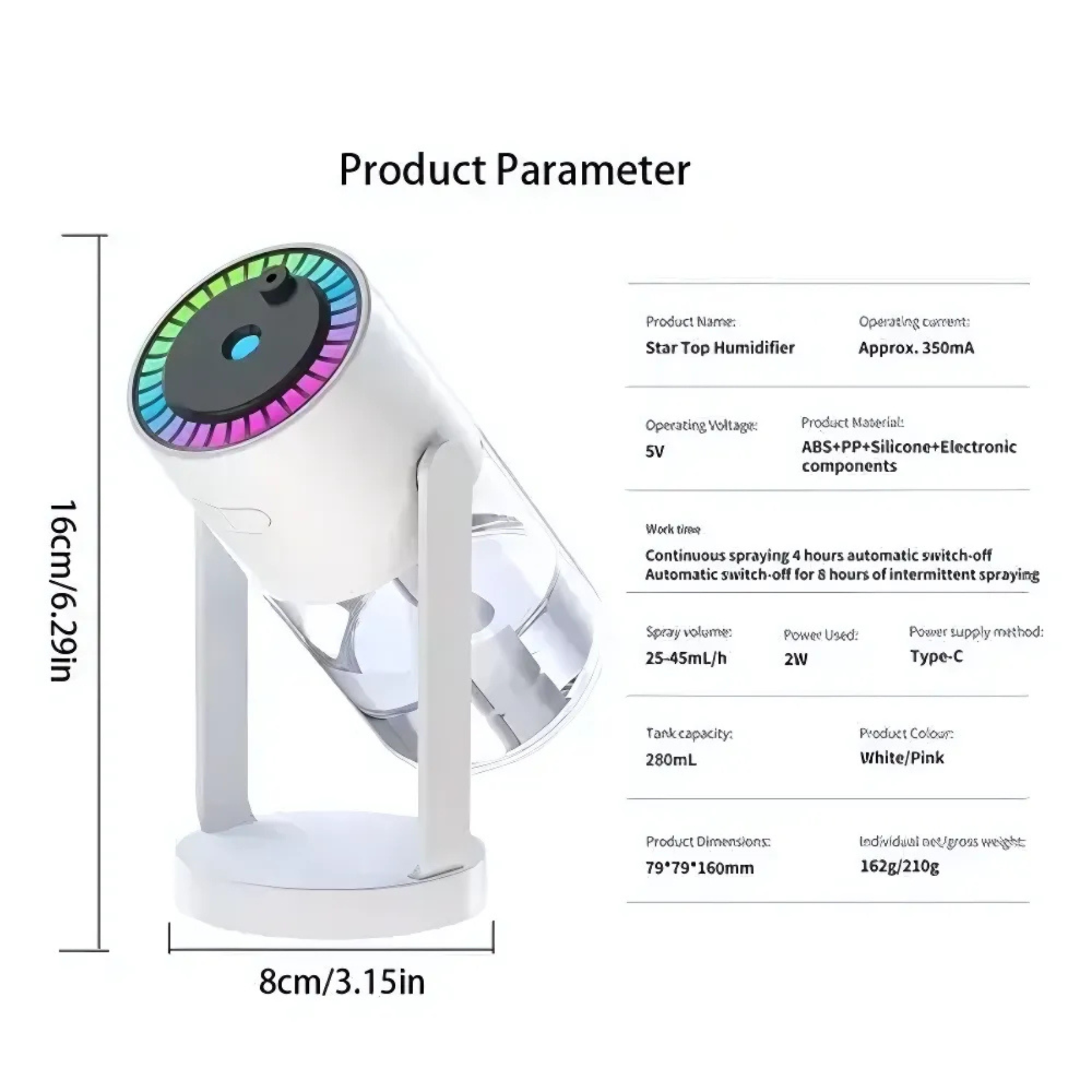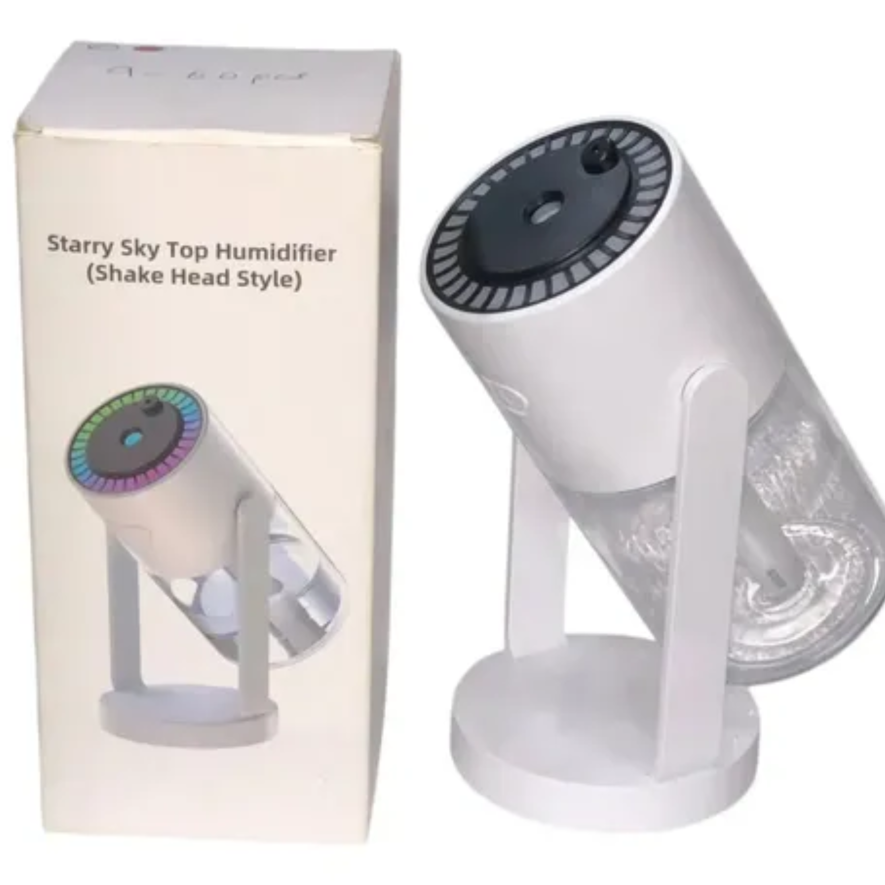 El  humidificador difusor de aceite con proyector de luz  es un dispositivo multifuncional que combina la humidificación del aire, la aromaterapia y la ambientación luminosa. Funciona con agua y aceites esenciales, generando una fina niebla que mejora la calidad del aire, hidrata la piel y ayuda a aliviar la sequedad. Además, incorpora un proyector de luz LED que crea efectos visuales relajantes, perfectos para la decoración y el descanso. Su diseño compacto y silencioso lo hace ideal para dormitorios, salas de estar, oficinas o espacios de relajación.
