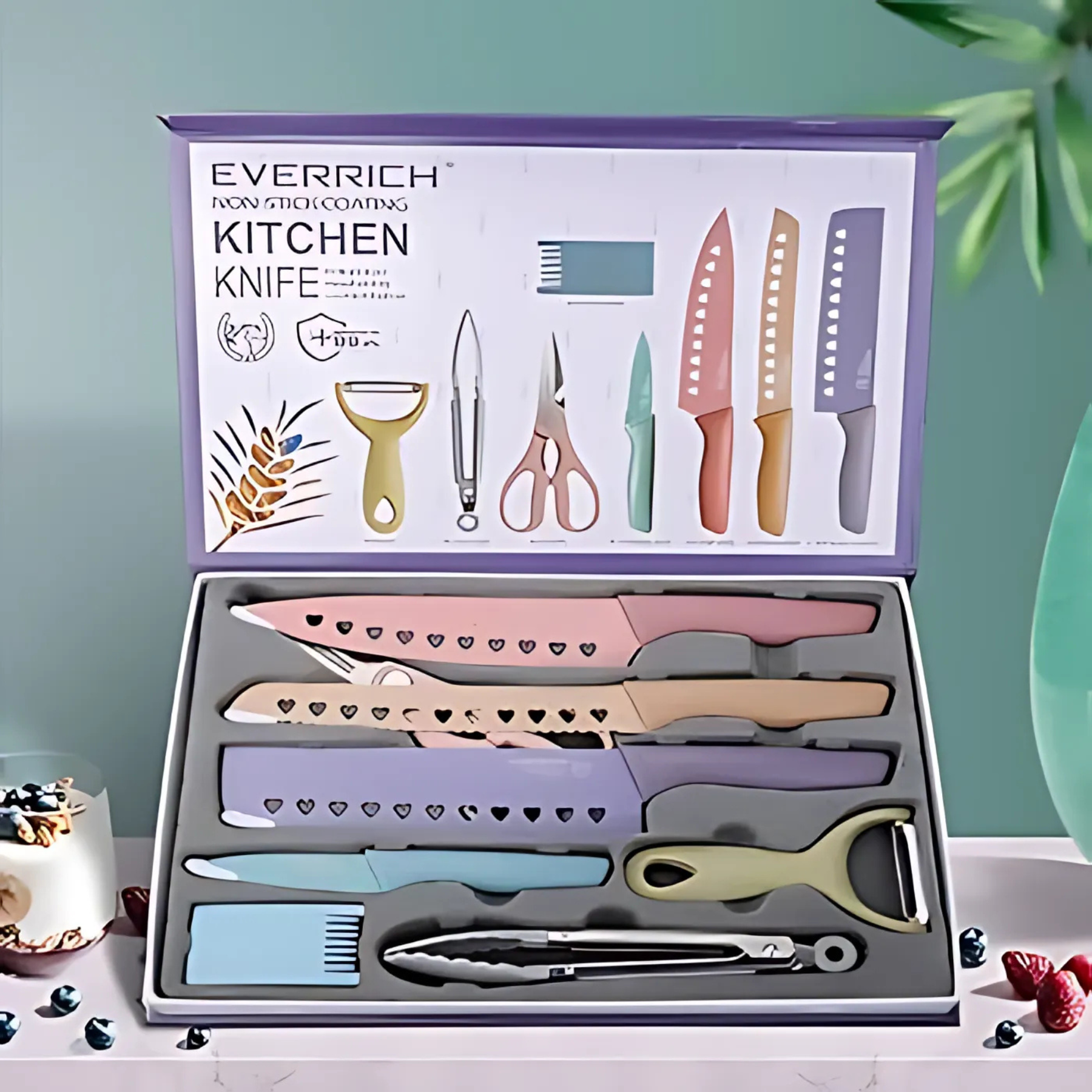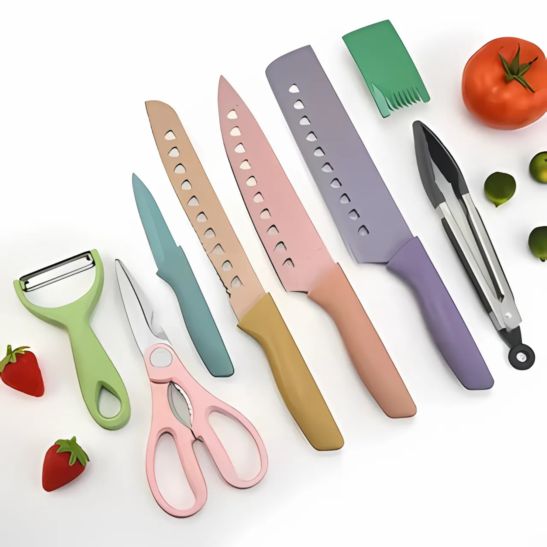 El conjunto completo brinda herramientas para tareas variadas: pelar frutas, cortar quesos, abrir empaques con las tijeras e incluso mantener los cuchillos afilados con el afilador incluido.