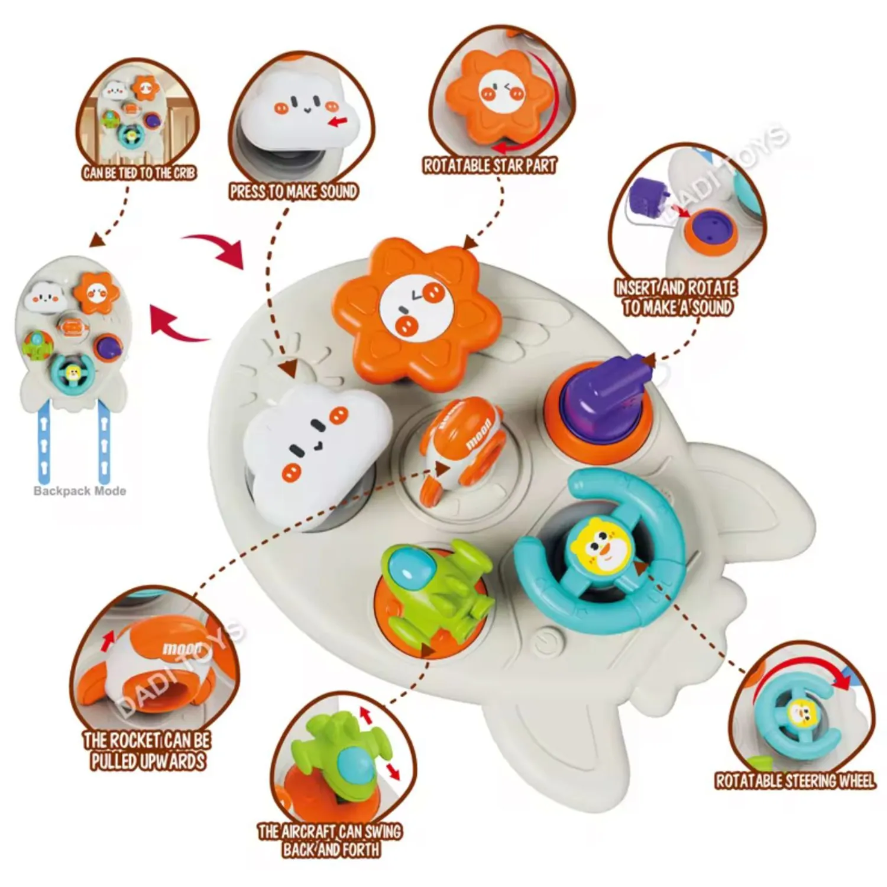 Motricidad fina : Ayuda al bebé a ejercitar sus manos al agarrar, presionar o manipular las partes del cohete.