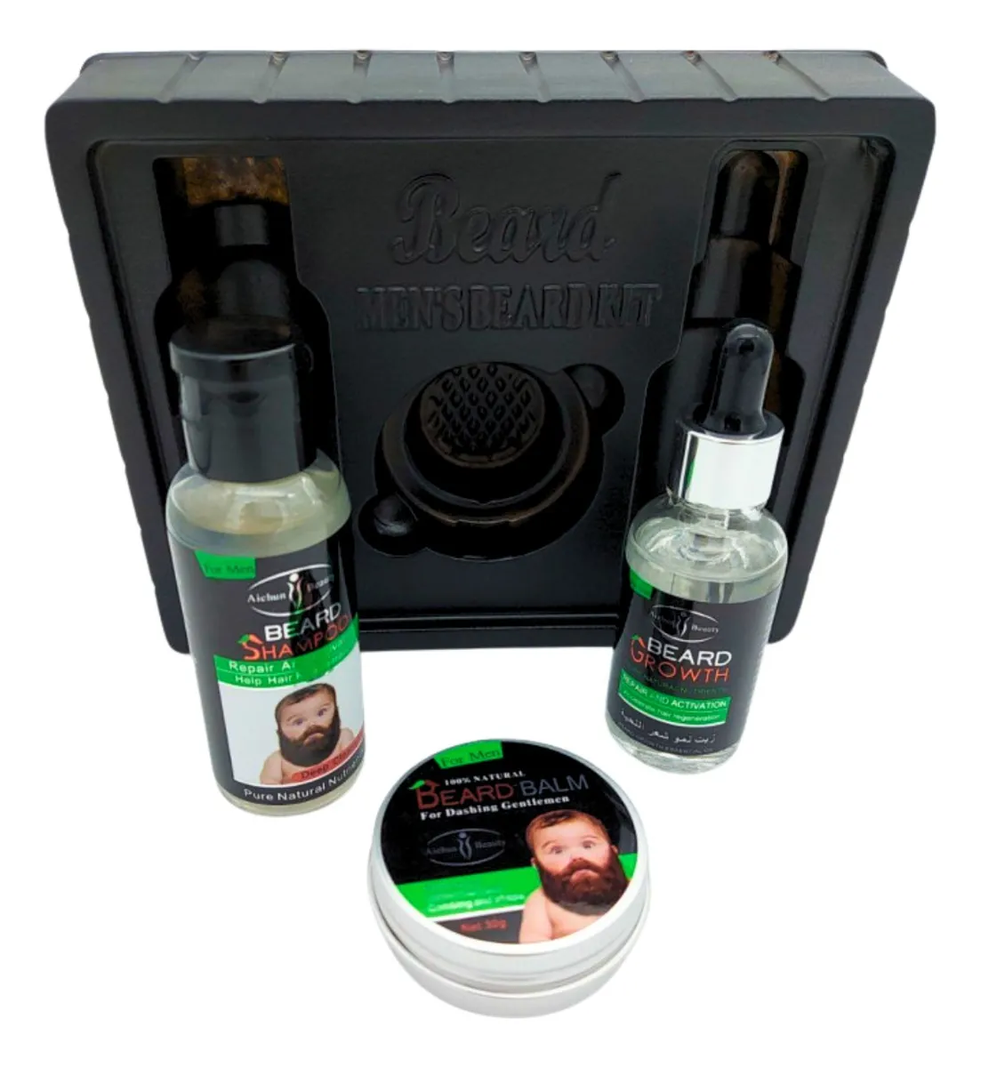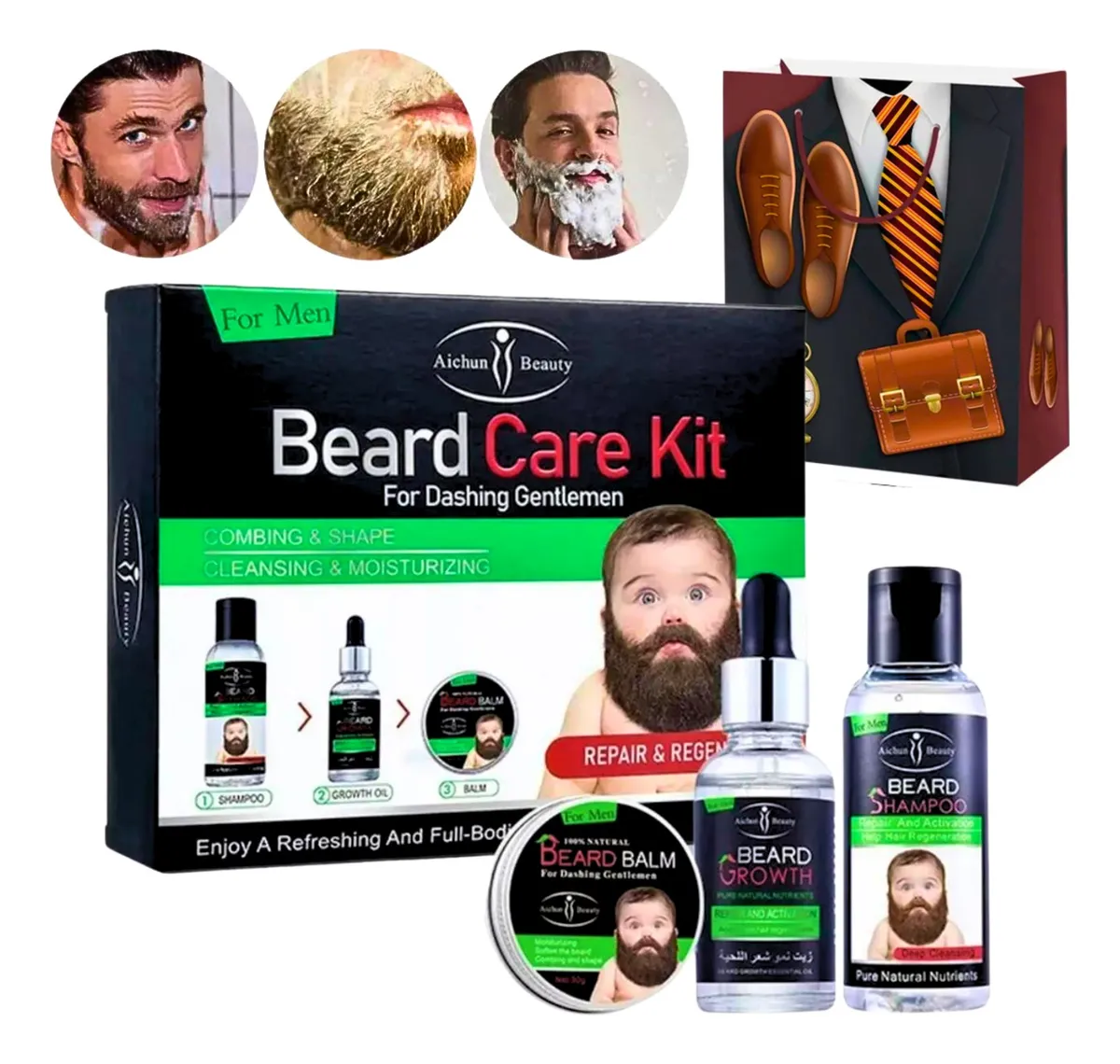 Palabras clave incluidas: kit de barba, cuidado de barba, shampoo de barba, aceite para barba, bálsamo para barba, crecimiento de barba, barba saludable, grooming masculino, Aichun Beauty, kit 3 en 1.