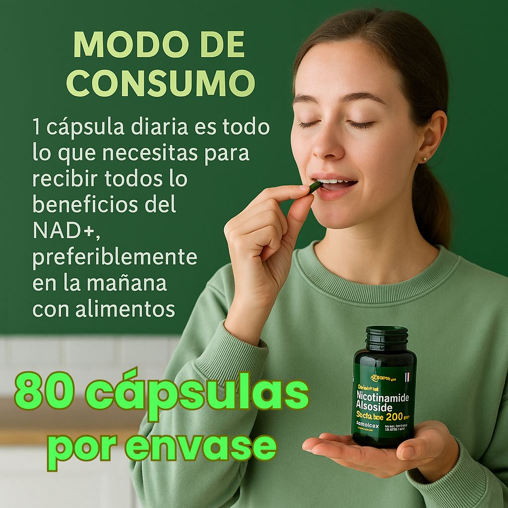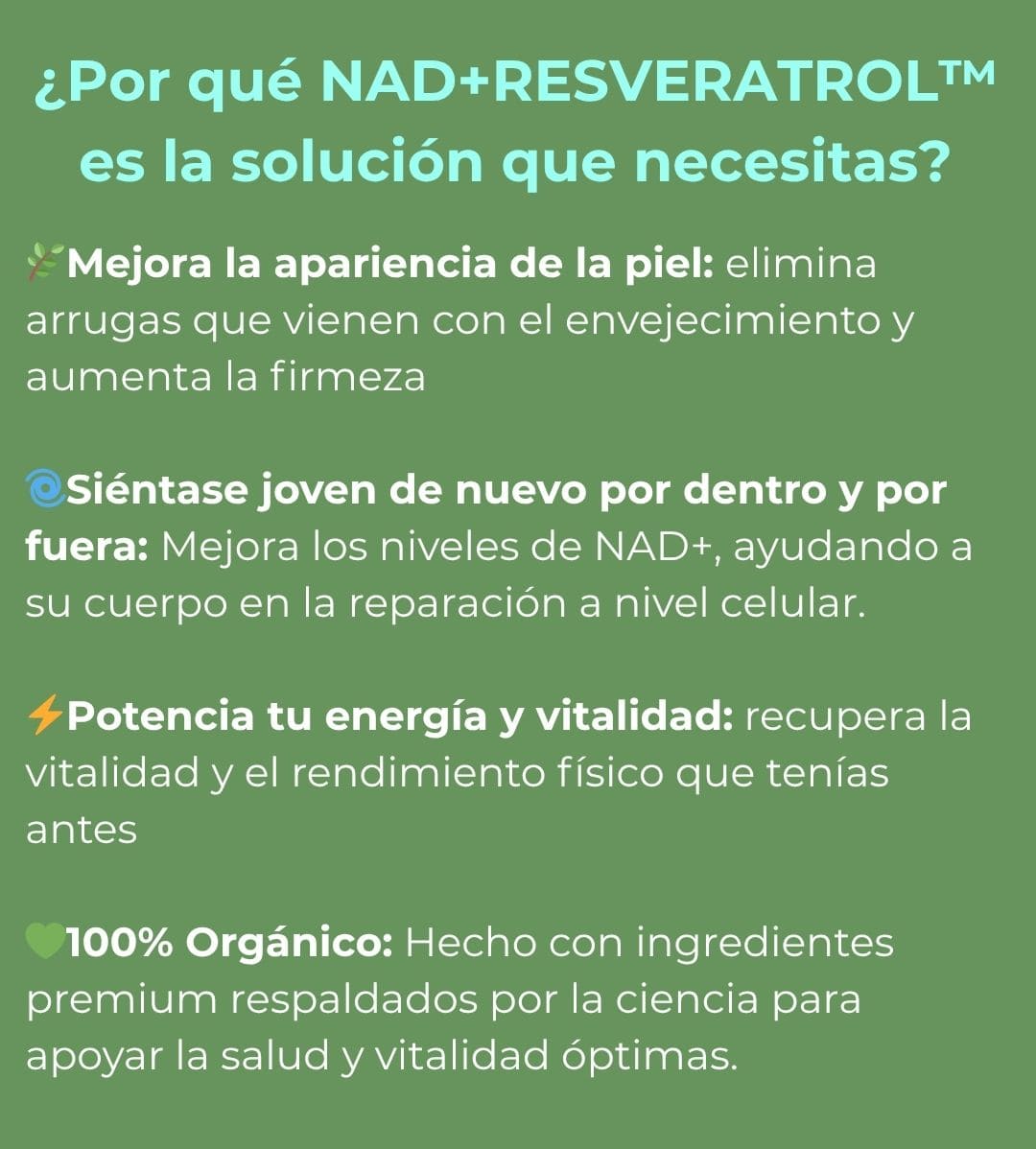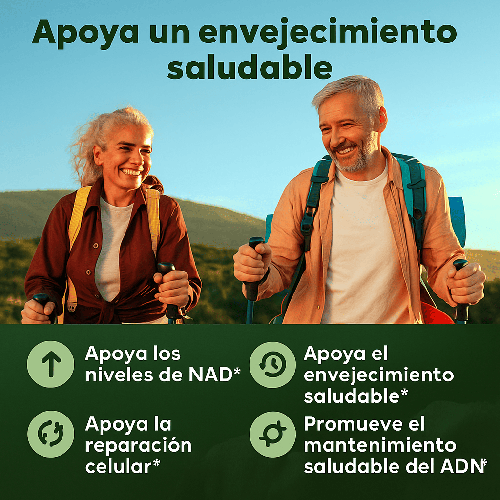 Descubre una fórmula avanzada que combina ribósido de nicotinamida (NR), resveratrol liposomal y quercetina antioxidante para elevar tus niveles de NAD+, combatir el envejecimiento celular y potenciar tu rendimiento físico y mental.