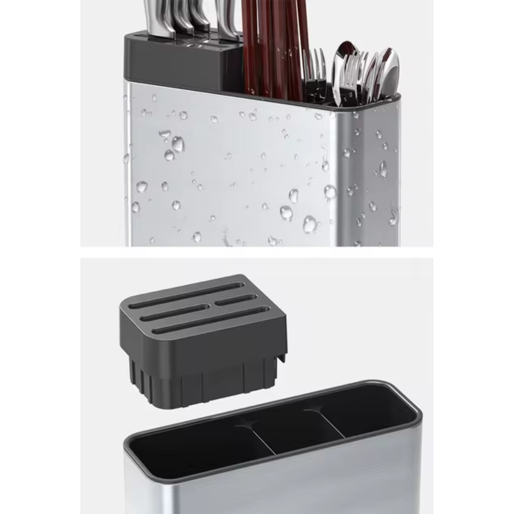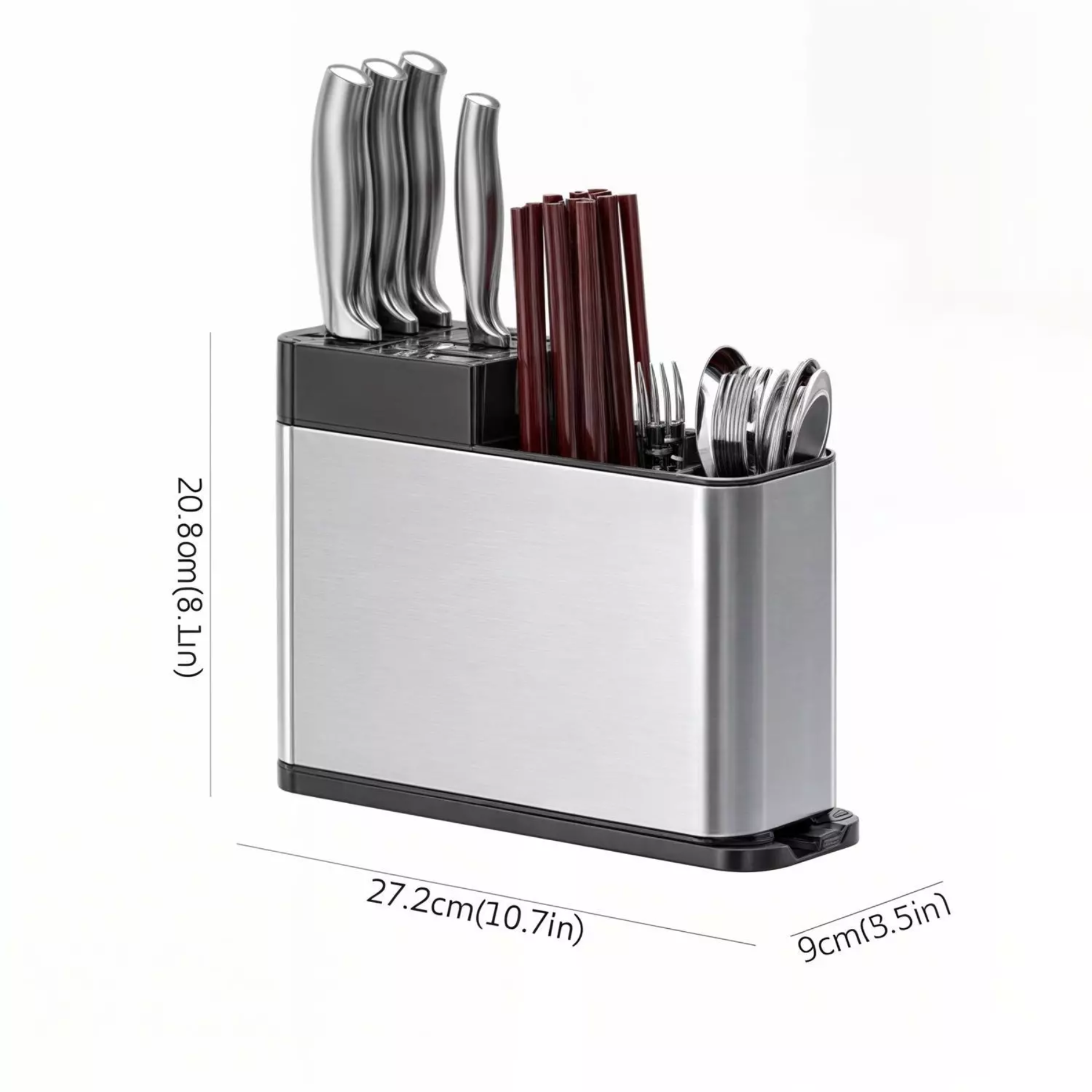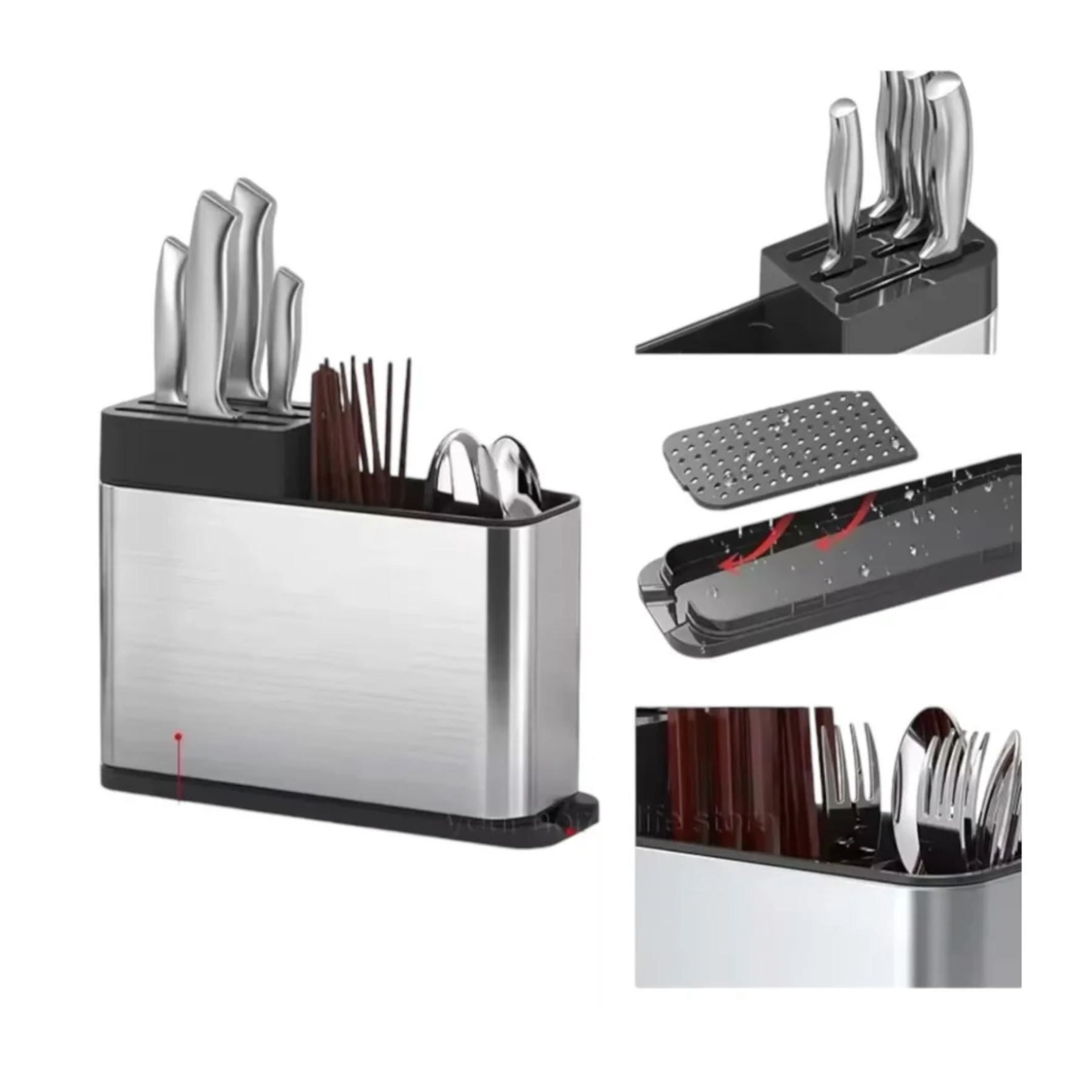 El porta cubiertos de acero inoxidable plateado es un accesorio práctico y elegante para organizar cubiertos en la cocina o el comedor. Está fabricado en acero inoxidable resistente a la corrosión, lo que garantiza durabilidad y fácil limpieza. Su acabado plateado le da un toque moderno y confortable, combinando con cualquier estilo de cocina o mesa. Puede tener compartimentos internos o ser de diseño abierto, ideal tanto para uso diario como para ocasiones especiales.
